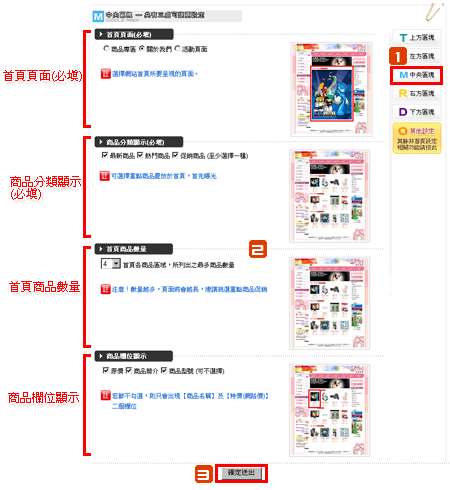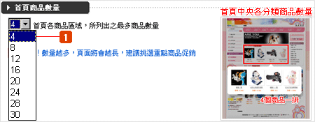 選擇數量:設定首頁中央商品分類下,列出之最多商品數量。 |