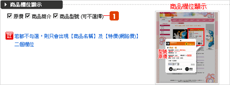 勾選顯示商品欄位:商品列表欄位預設有「商品名稱」及「特價」,除此外您可自行勾選其他是否顯示。  |