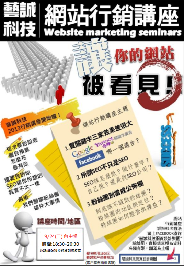 當然我們不能說以上這些認知是錯誤的,但至少它們是不夠、不完整的觀念,為此,我們將在9/24(二)晚上6:30~8:30 在本公司舉辦網路行銷講座,除了分享我們對網路行銷的看法,也歡迎貴公司來與我們一起討論,讓我們共同將貴公司的網站、網路行銷經營得更加有聲有色。